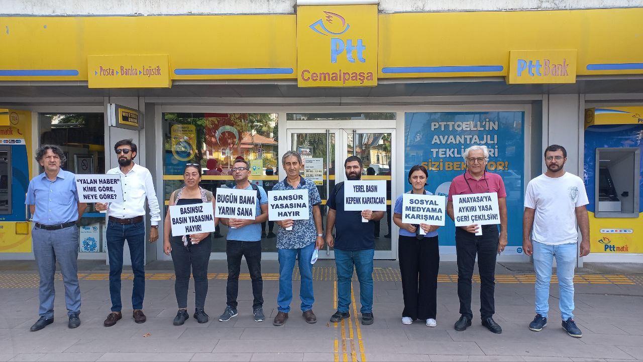 Türkiye Gazeteciler Sendikası (TGS) Adana Şubesi’ne mensup gazeteciler, sansür yasasına karşı Cemalpaşa Postanesi önünde toplandı.